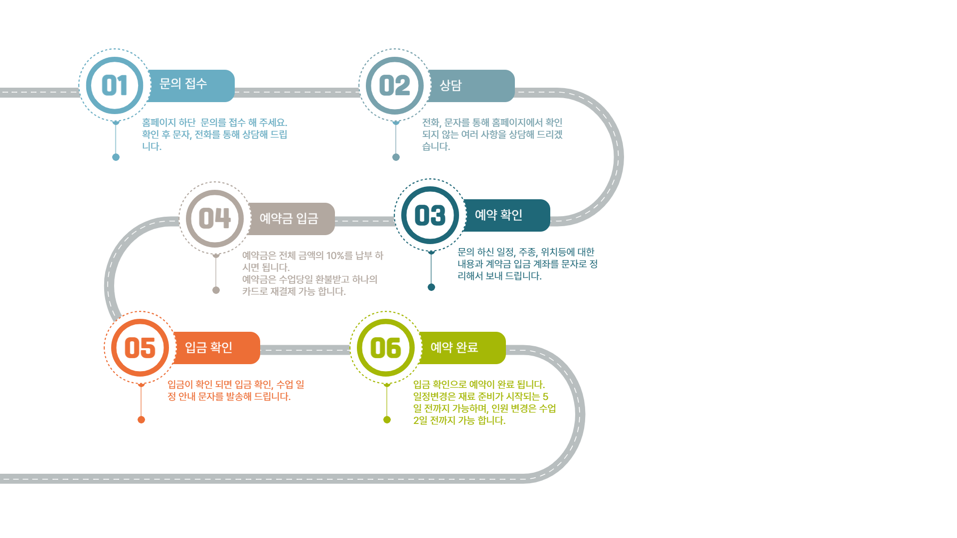교육문의 접수 - 상담(문자, 전화) 주종, 요일, 시간, 선택 - 예약내용 확인문자 발송 - 예약금 입금 - 입금 확인 문자 발송 - 예약 완료